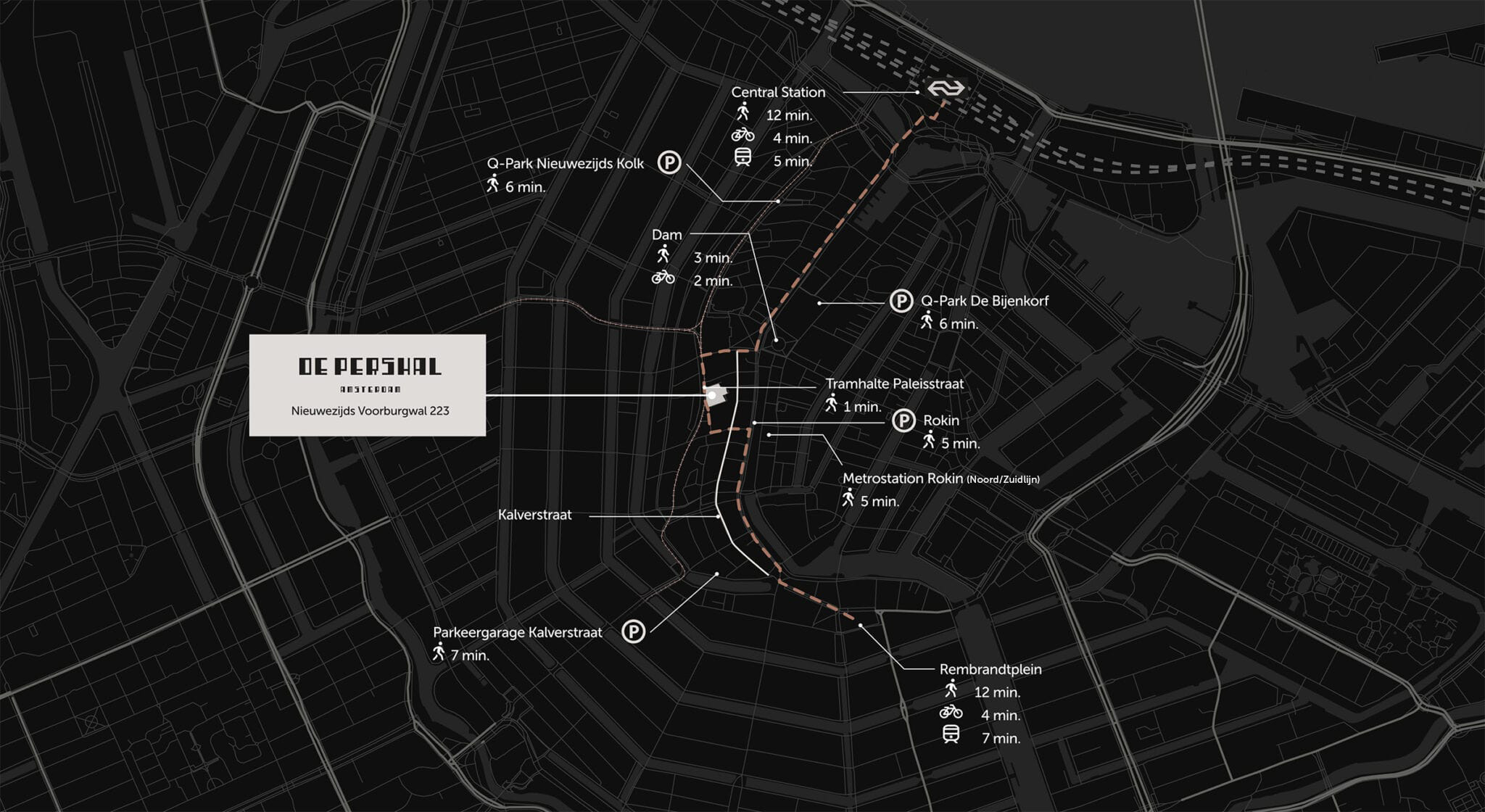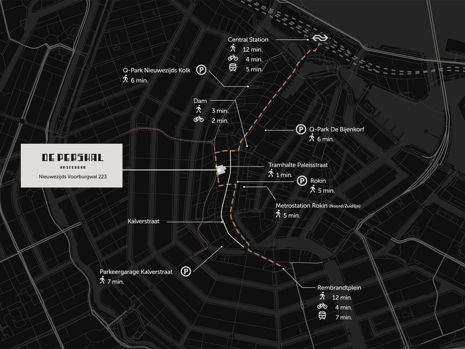 De Pershal is met het OV en fiets/scooter uitstekend bereikbaar. De halte Dam en Rokin van de Noord/Zuidlijn zijn op loopafstand. Tevens zijn er verschillende parkeergarages in de directe omgeving.